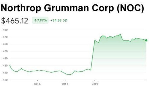 War profiteering: Northrup Grumman stocks climb 8.4% – increasing total valuation to $71 billion – in the days after Al-Aqsa Flood and subsequent invasion of Gaza by Israeli forces in early October, 2023 https://www.calcalistech.com/ctechnews/article/sypn3yewp